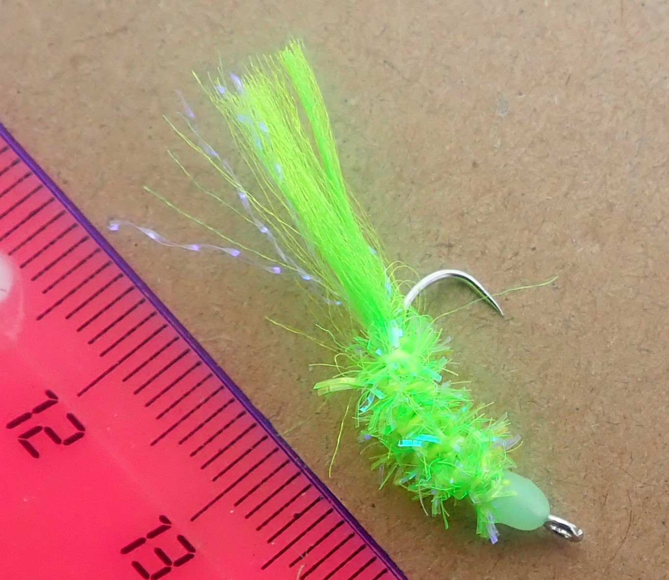 Самосброс на крупную корюшку на меляках Тело УФ салатовый Синель Вапси Хвостик УФ Салатовый Антрон Вапси и люрекс Кеймура Тохо Головка пластик фосфор