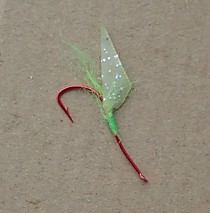 Ярко красные крючки Угорь № 6 мм с мушкой крыло рыбья кожа фосфор с блесками фирмы Хаябуса и бородками шелк Салат УФ Текстрим . Хорошо ловит в Сумерках Крючки на ставриду корюшку японские фирмы Ямаи