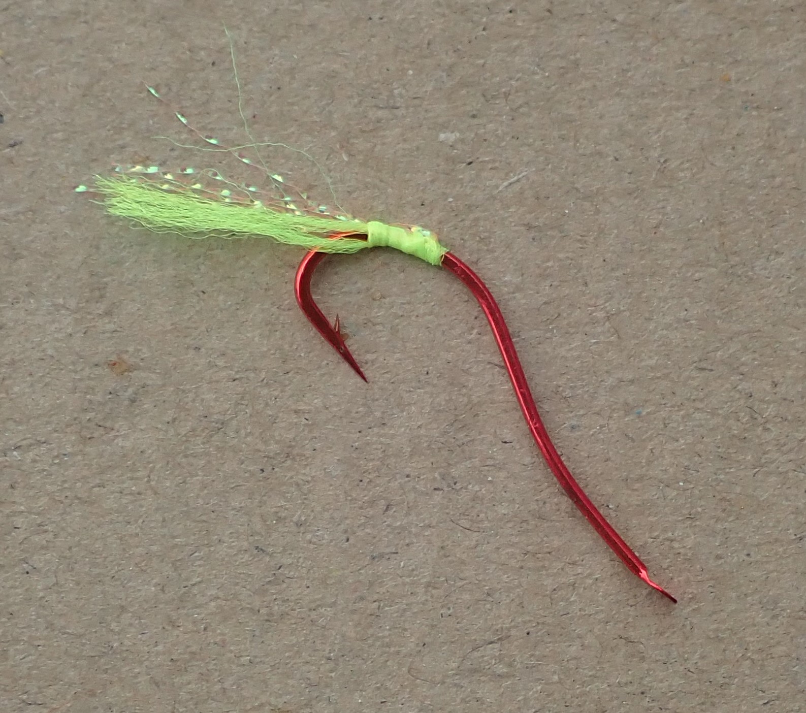 ярко красные крючки № 6 мм на корюшку селедку ставриду с мушкой лимонный УФ Обьемный шелк Фл Лимон с люрексом Текстрим Италия. мушка простая но уловистая так как для всех селедок и ставридок не нужны крупные наживки их корм мелок