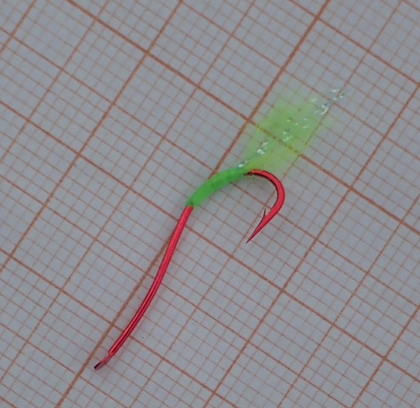 ярко красные № 6 мм на корюшку селедку ставриду с мушкой салатовый УФ из обьемного шелка с люрексом кристалл фирмы Текстрим . Несмотря на простату очень уловиста так как корм морских рыбок типа селедки очень мелкий Крючки Япония фирмы Ямаи