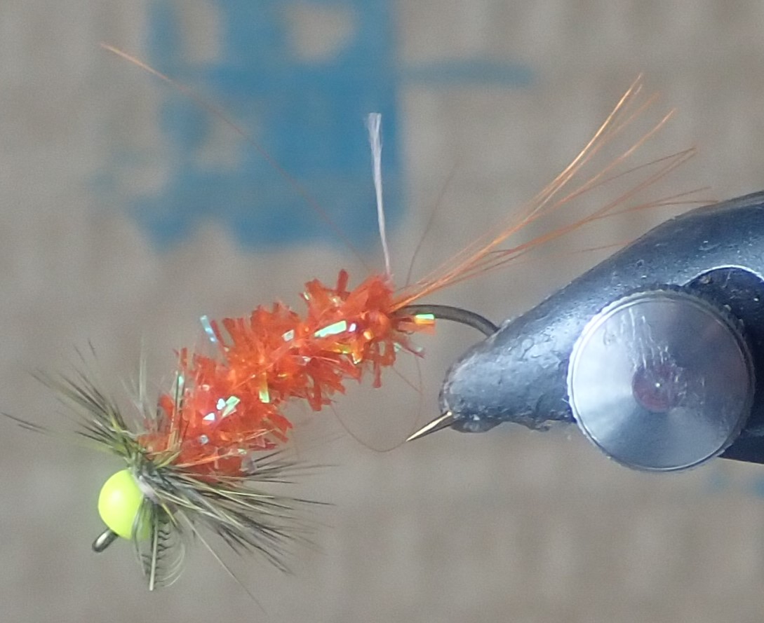 Уловистая грузовая мушка на хариуса ленка с телом из Красной синели , Щетинки мех козы, ножки - Жабо из пера Премиум Петуха цвет Гризли